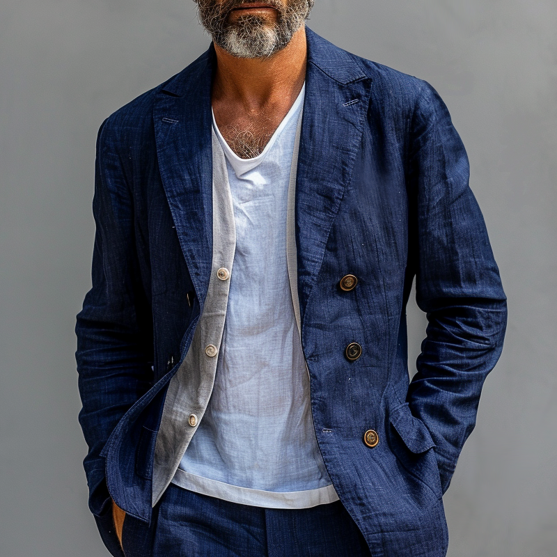 Men's Solid Cotton And Linen Notch Lapel Double Breasted Casual Blazer 53719048Z
