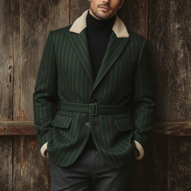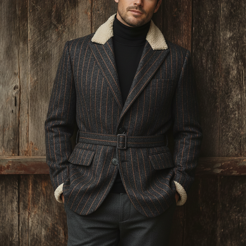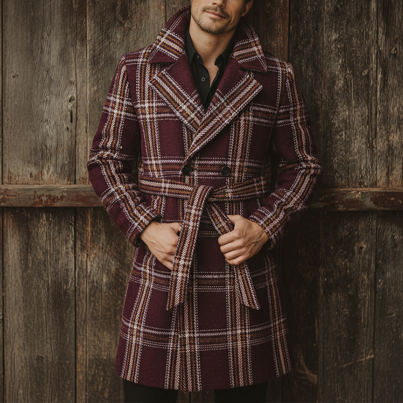 Men's Winter Fashion Plaid Faux Wool Double-Breasted Lapel Mid-Length Coat (Including Belt) MTA2550I3P