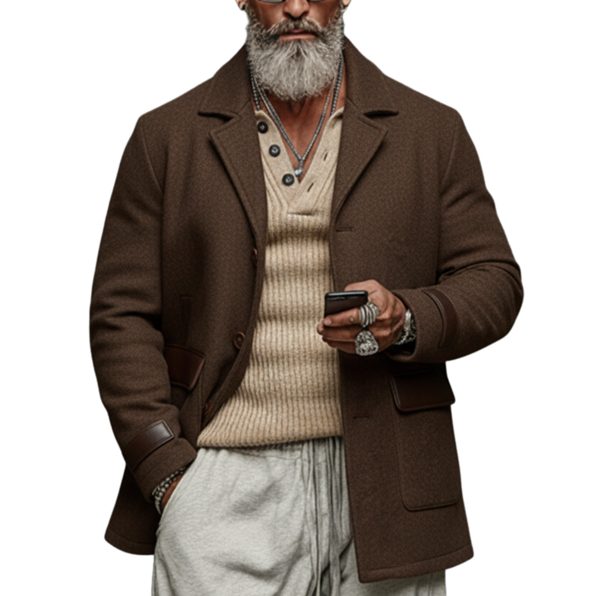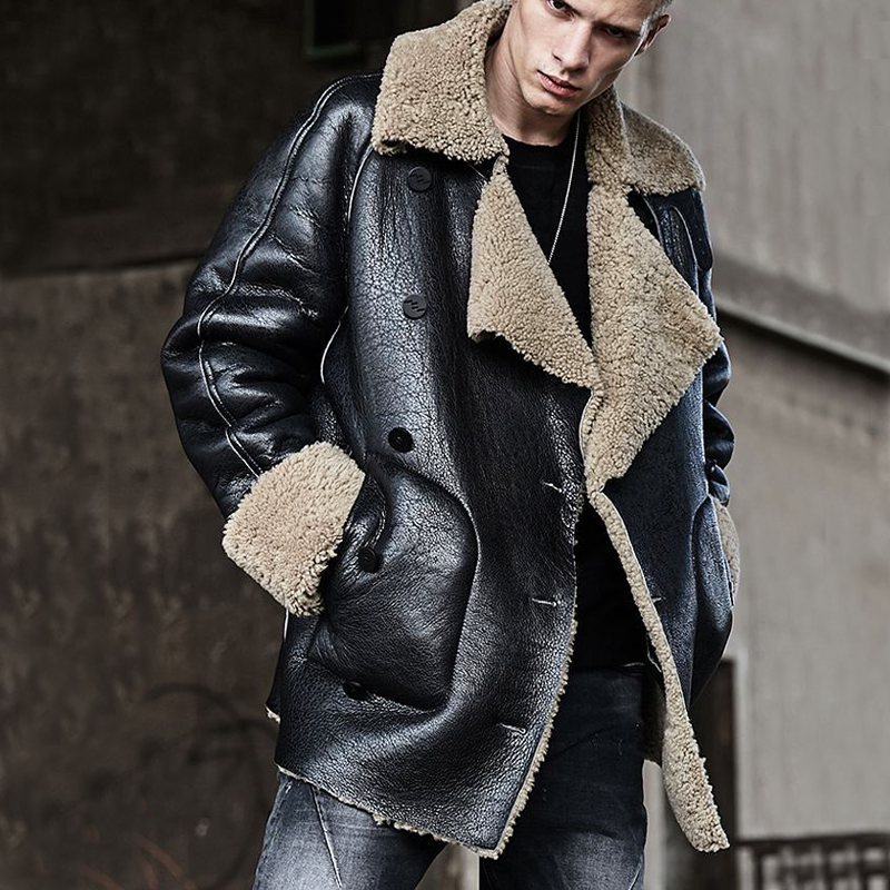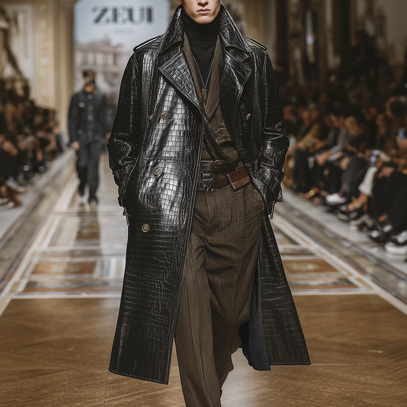 Men's Winter Fashion PU Patchwork Herringbone Faux Wool Double-breasted Mid-length Coat MTA2875I0P