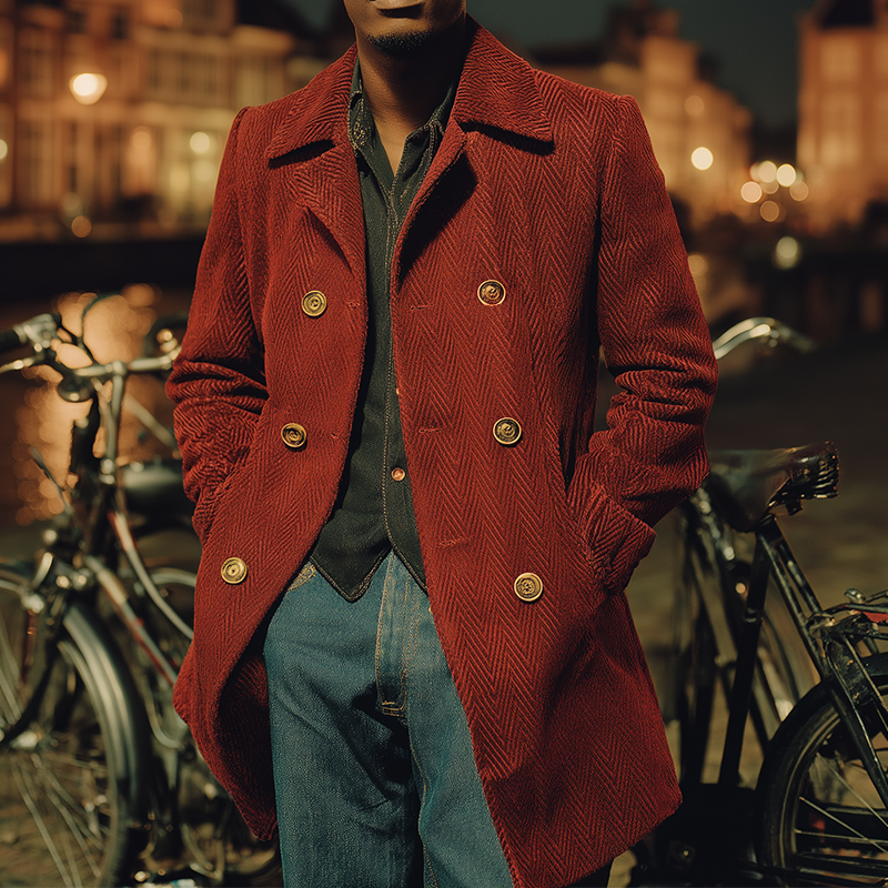 Men's Vintage Velvet Colorblock Trim Double-breasted Slim Fit Mid-length Coat 50331976M