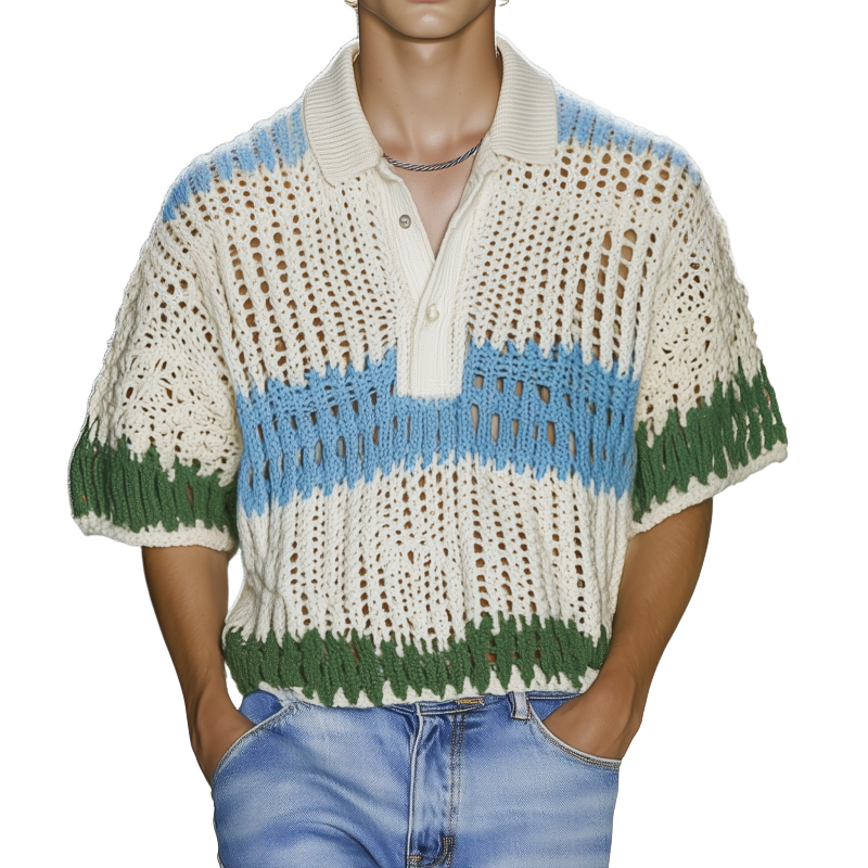 Men's Casual Contrast Striped Lapel Loose Short-sleeved Knitted Polo Shirt MTA1038F9M