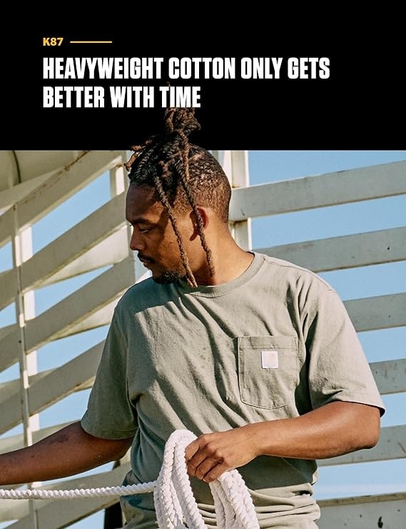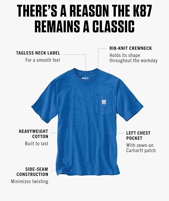 Our pocket t-shirt debuted in 1992, and its rugged cotton design and clean looks made it a fast favorite among the hard-working folks who pulled it on. Though decades and trends have come and gone, there's a reason the K87 remains a classic. This men's t-shirt is made with heavyweight cotton built to handle tough days on the job. It has an loose fit that gives you room to move and a soft feel that only gets better with time.