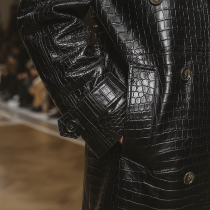 Introducing our Men's Winter Retro Crocodile Pattern Shiny PU Long Coat, a perfect blend of style, warmth, and luxury. This coat is characterized by its unique crocodile pattern and a glossy finish that adds a touch of sophistication and flair to any winter wardrobe.